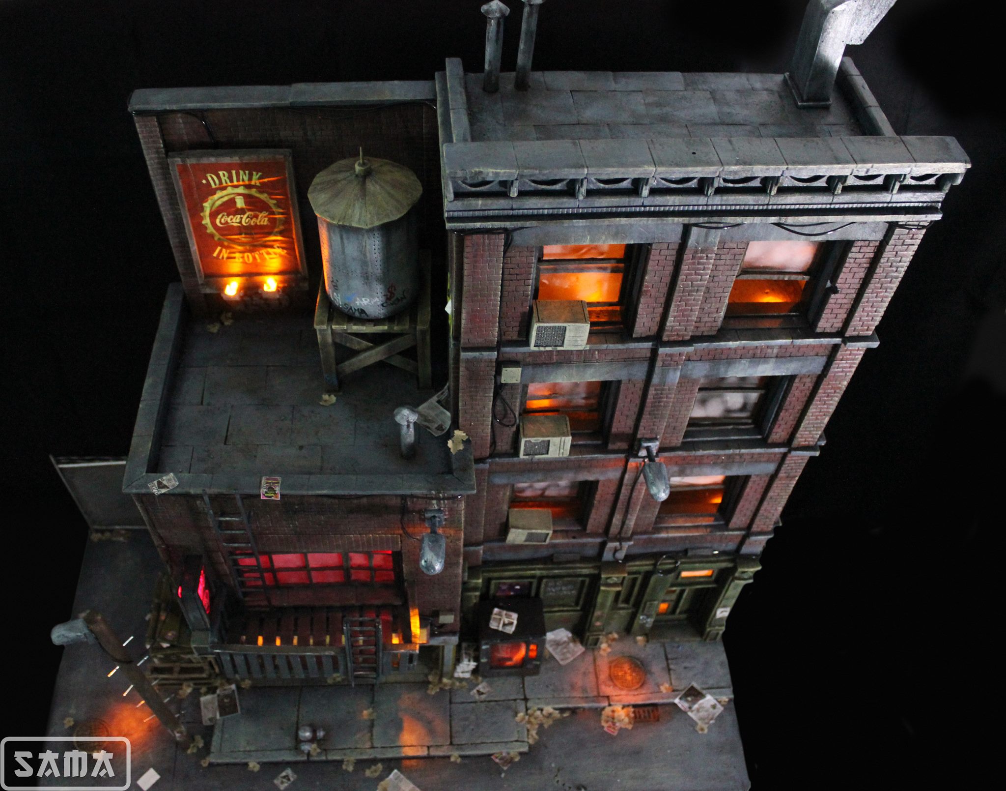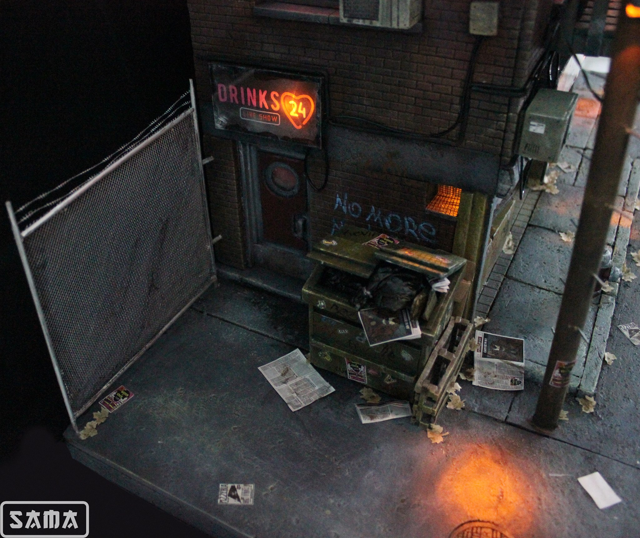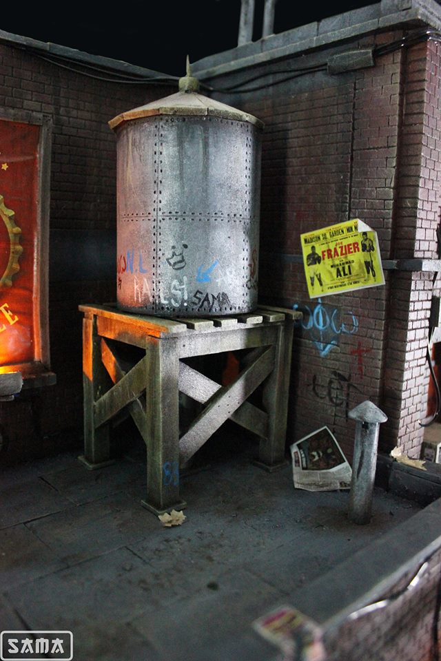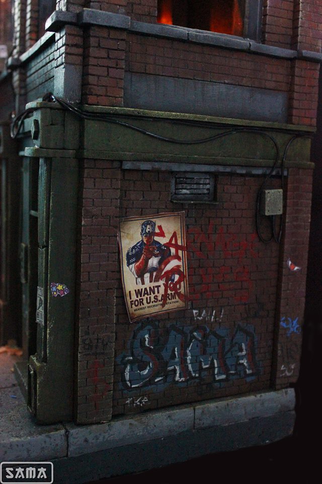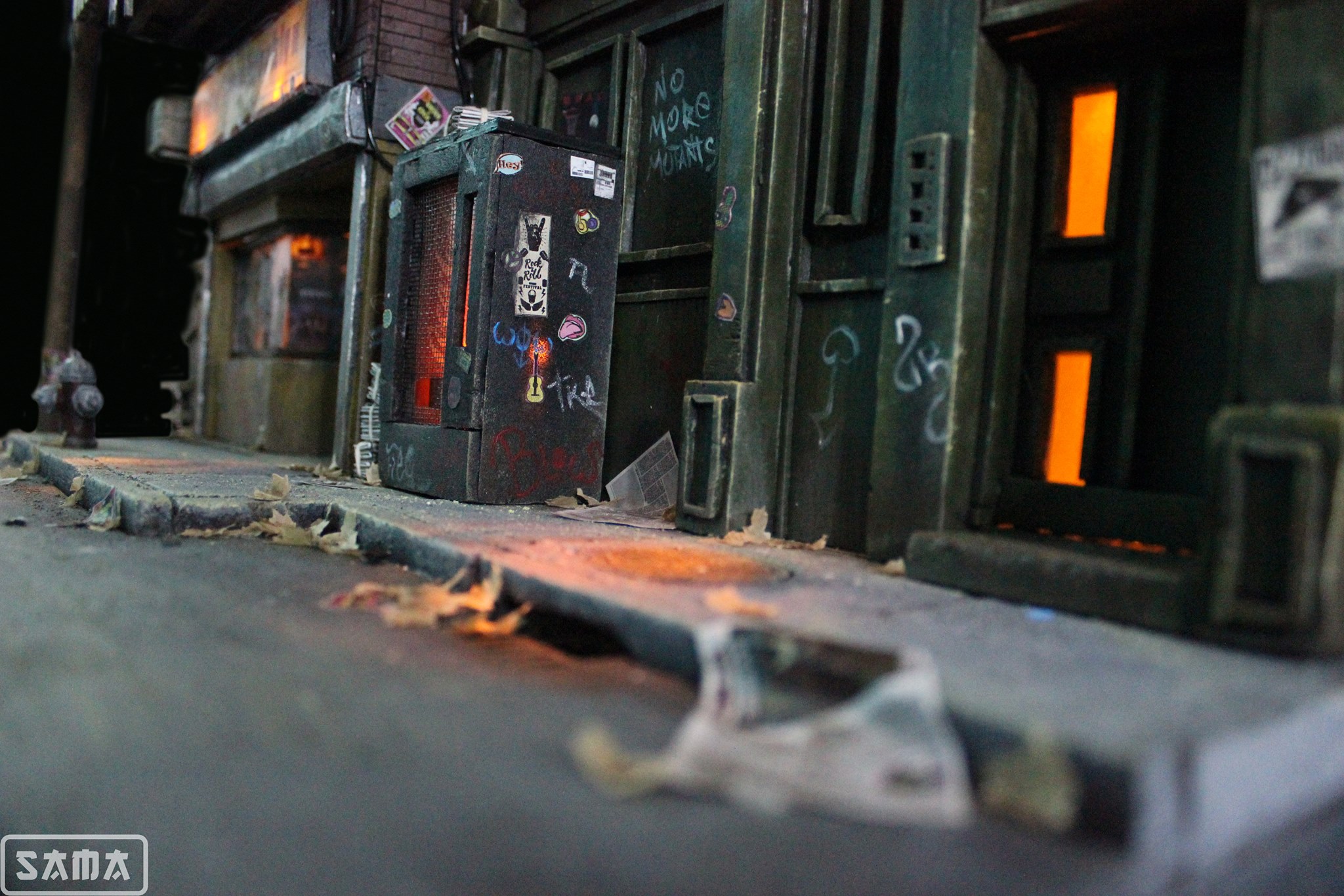 Recreación del característico barrio neoyorquino de Hell´s kitchen (La cocina del infierno), donde superhéroes como Daredevil, Punisher, Spiderman y cía batallan contra villanos como: Kingpin, Bullseye, El Ruso, etc. Diorama muy completo, donde la libertad dada por el coleccionista, nos ha permitido jugar con varios elementos típicos de las calles de la gran manzana, donde destaca multitud de detalles como la máquina expendedora de Coca Cola, un videoclub ochentero, un club, carteles, publicidad, un contenedor de basura… Este diorama ha sido ideado para las figuras de Marvel de plomo escala 1/18. Figuras realmente pesadas, por ello se tuvo que tener en cuenta a a hora de reformar piezas del diorama cómo las escaleras de emergencia. Hemos de reconocer que estos dioramas Marvel de Hell´s Kitchen y el de Días del futuro pasado son nuestros preferidos.